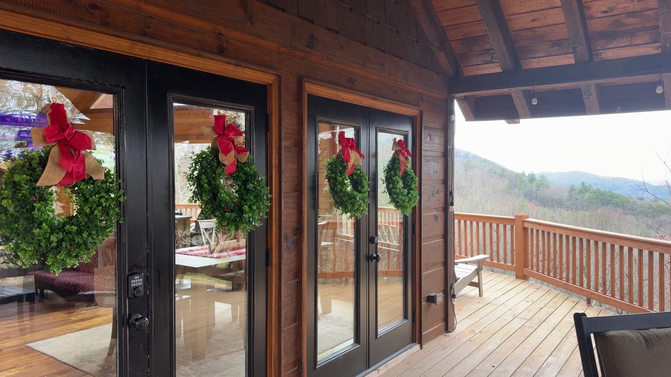 The covered front porch has a cozy seating area around the wood burning outdoor fireplace with reclaimed Mountain Laurel deck railing. This deck wraps around the main level of the cabin including the prowl front facing the view with seating for the views of the mountain or the evening sunsets. The main level has a gourment granite counter topped kitchen and great room. The kitchen has stainless steel appliances as well as stacked stone bar with bar stool seating for three guests. The greatroom has soaring high ceilings, lots of large glass windows for viewing the mountains, a stone gas log fireplace, cozy sofa seating, and a dining table for 6 guests. Just off the kitchen is a half bath and the main level bedroom. This bedroom has a Queen sized bed and its own ensuite bathroom with a double vanity granite counter top and tile walk in shower shower and soaking tub.